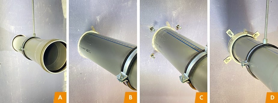 - Aplieciet ugunsdrošo manšeti ap cauruli un savienojiet abas caurules daļas. Pārliecinieties, ka ugunsdrošām manšetes stiprinājumu cilpas cieši novietotas pie sienas virsmas.