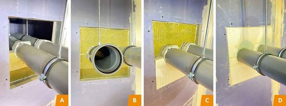 Knauf FireWin speciālists demonstrē dažādus blīvēšanas risinājumus, kurus var izmantot vienām un tām pašām caurulēm ugunsdrošās metāla karkasa starpsienās. Šajā rakstā uzziniet vairāk par Knauf FPG Graphite ugunsaizsardzības grafīta hermētiķi, Knauf Firecollar ugunsaizsardzības manšeti, Knauf Firewrap ugunsaizsardzības lenti un Knauf FPC Panel ugunsaizsardzības plāksnes montāžu. Visos gadījumos FireWin speciālists izmanto degtspējīgas caurules Ø110 mm un sienas konstrukciju W112 Knauf metāla karkasa starpsienu ar CW50 profilu karkasu, divkārtu apšuvumu Knauf Blue GKFI 2x12,5 mm. Kopējais sienas biezums - 100 mm.
