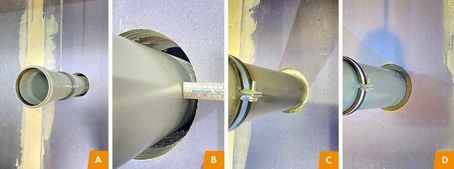Degtspējīgu cauruļu ugunsdrošai blīvēšanai abās sienas pusēs jāuzstāda Knauf Firecollar ugunsaizsardzības manšetes.