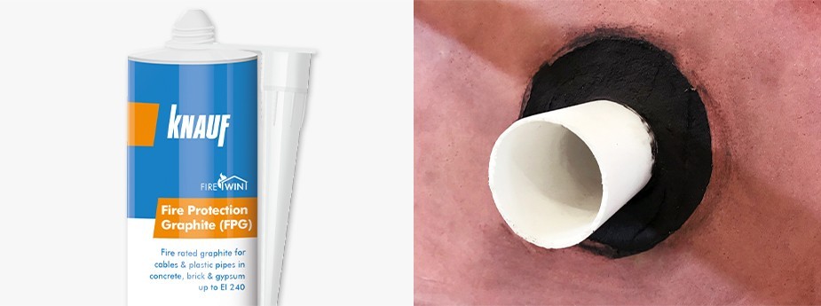 Knauf Fire Protection Graphite is a high specification formulation designed to prevent the spread of fire, smoke and gases through openings in fire rated walls and floors. Knauf Fire Protection Graphite expands when it is subjected to fire and closes openings around penetrations when any combustible or low temperature melting materials have burnt away.